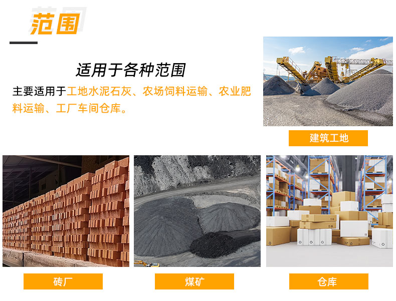 主要適用于工地水泥石灰、農場飼料運輸、農業(yè)肥料運輸、工廠車間倉庫。